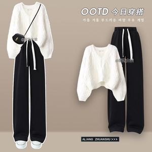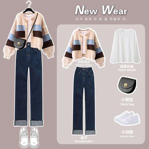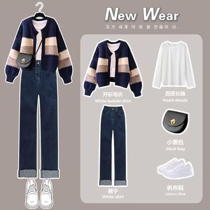 大码女装秋季套装女2025新款针织开衫毛衣显瘦打底衫牛仔裤三件套