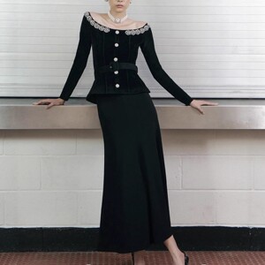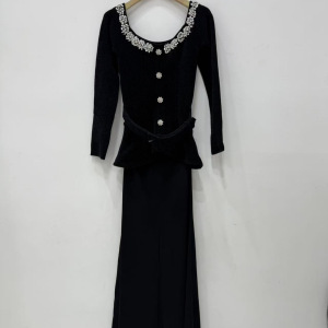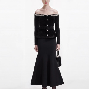 法式小众2025秋冬新款气质名媛风钻饰一字领丝绒长袖针织连衣裙女