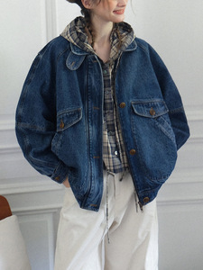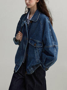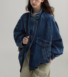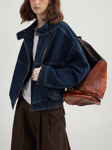 Le北欧中古感/水洗牛仔肌理翻立领撞色廓形感飞行员夹克外套女