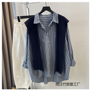 披肩假两件条纹衬衫女宽松设计感小众高端中长款两件套纯棉衬衣秋