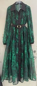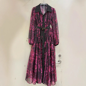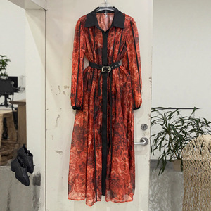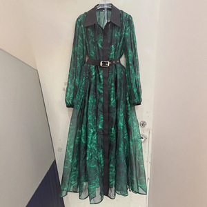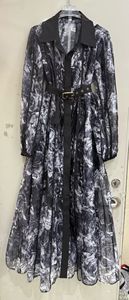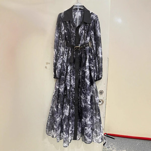 2025秋冬新款水墨油画翻领腰带扎染女装高腰中长款长袖拼接连衣裙
