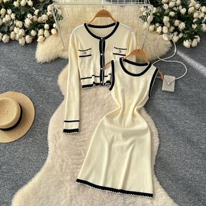 小香风名媛高级感套装女秋季时尚撞色圆领长袖针织开衫无袖背心裙