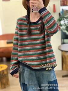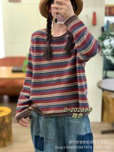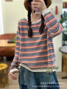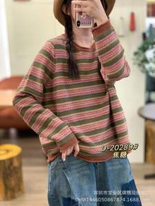 琪镌绘制秋季款条纹长袖针织衫女小众休闲圆领宽松套头上衣20289