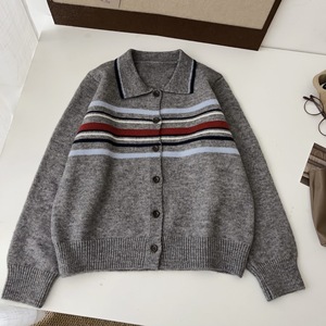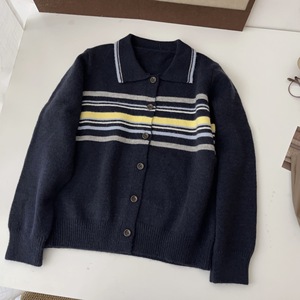 条纹撞色翻领针织开衫女秋冬新款韩版宽松显瘦简约百搭上衣2025年