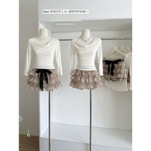 细腻水溶C~超爱荡领针织八分袖上衣+蛋糕半裙两件套