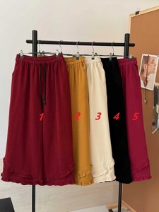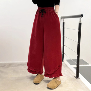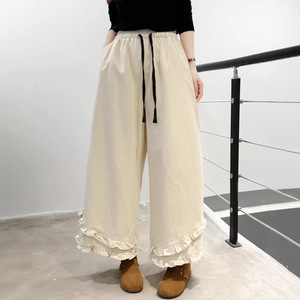 2025早秋新款文艺复古宽松棉麻纯色花边抽绳松紧腰时尚百搭休闲裤