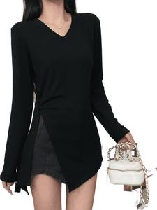 侧边开叉不规则长袖T恤女秋季设计感修身显瘦圆领打底衫独特上衣