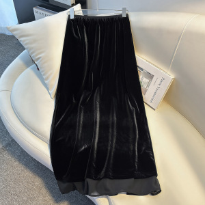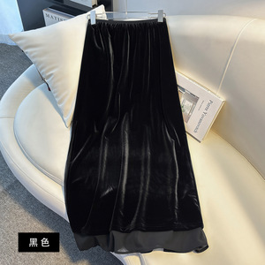 黑色金丝绒半身裙女秋冬季2025新款松紧腰A字中长款开叉直通裙子