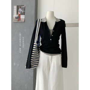 设计感撞色假两件翻领修身休闲针织衫女士秋季韩版高级感长袖上衣