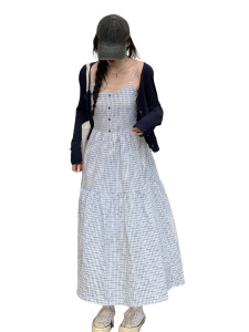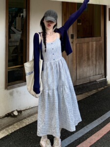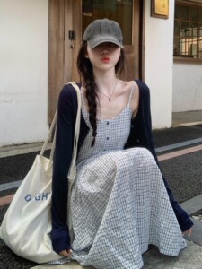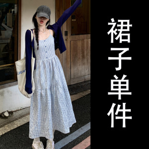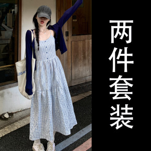 法式蓝色吊带格子连衣裙子女早秋2025新款海边度假巨好看长裙套装