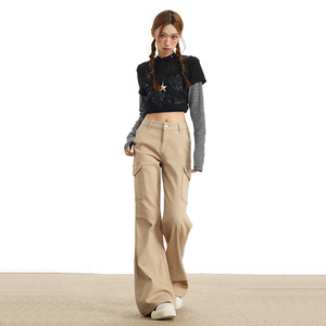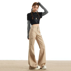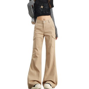 卡其色工装微喇牛仔裤女2025秋季新款修身显瘦不贴腿多口袋喇叭裤
