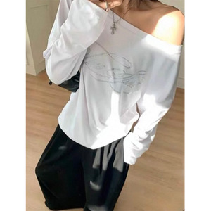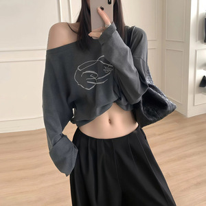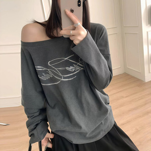 十三行美式休闲字母烫钻印花斜领露肩T恤女秋长袖辣妹宽松上衣
