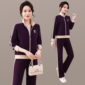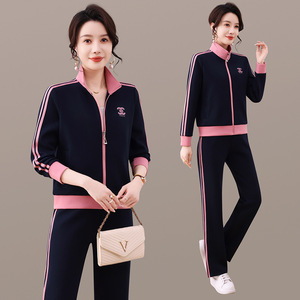 立领卫衣直筒卫裤时尚休闲运动套装女春秋季撞色中年妈妈装两件套