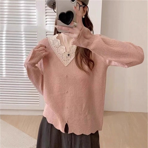 法式V领蕾丝花边针织衫女秋季2025新款设计感小众打底衫长袖上衣