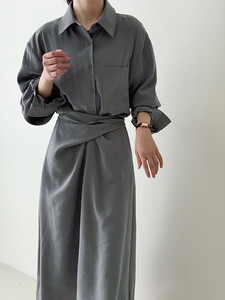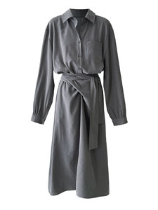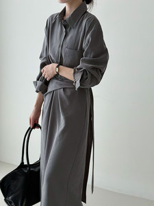 鹿西 韩系知性温柔衬衫绑带连衣裙女秋季新款不规则气质长裙9779