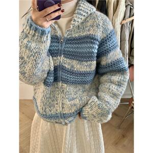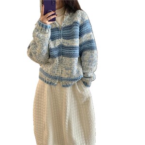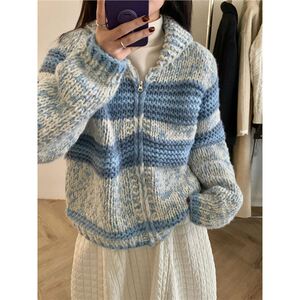 2025秋冬新款复古慵懒风翻领拉链粗线毛衣开衫女宽松加厚针织外套