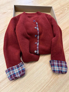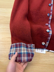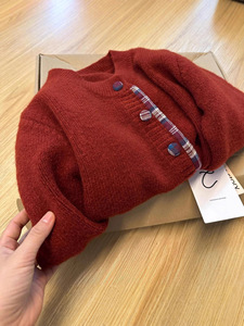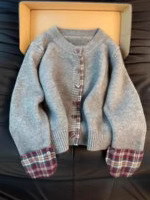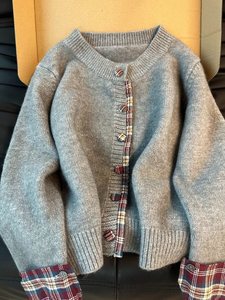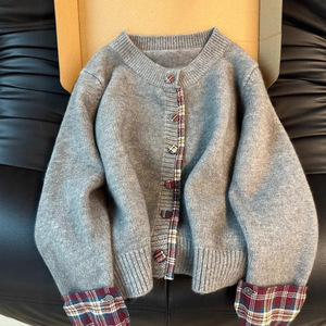 圆领拼接格子毛衣女假两件韩系2025秋冬新款宽松休闲针织开衫上衣