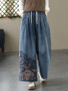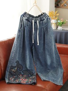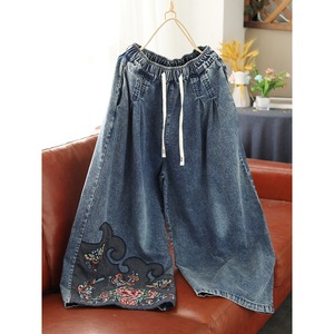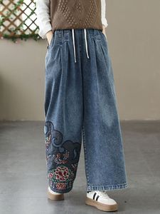复古刺绣牛仔阔腿裤女春秋年新款松紧腰系带牛仔裤女百搭长裤