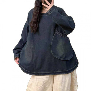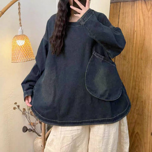 2025秋季新款复古宽松圆领套头衫长袖水洗牛仔卫衣百搭简约上衣女