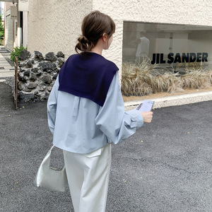 浅蓝色韩系针织披肩衬衫套装女2025秋小个子气质休闲阔腿裤两件套