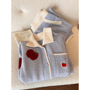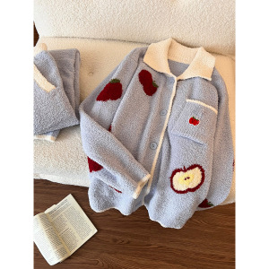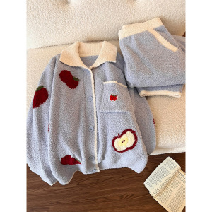 少女卡通可爱苹果印花半边绒睡衣女冬季新款家居服大码加厚两件套