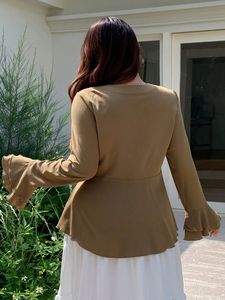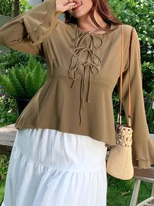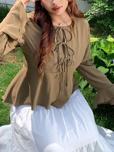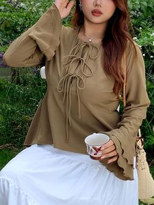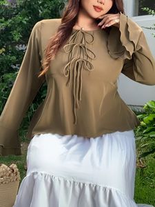 欧美外贸跨境大码女装喇叭袖衬衫 胖妹妹修身绑带长袖上衣女秋冬