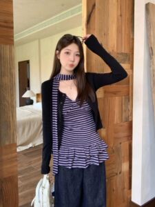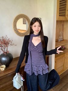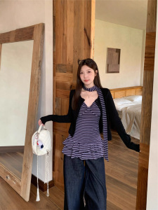 2025年大码胖MM秋季新款韩系纯欲风条纹吊带背心显瘦开衫上衣套装