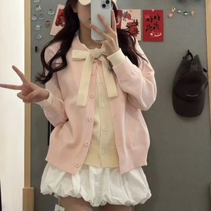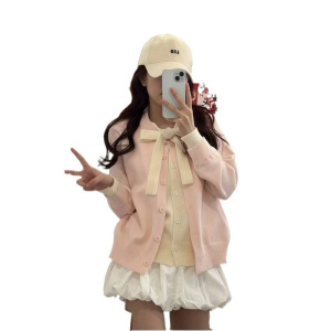 韩系撞色假两件拼接开衫女毛衣2025秋冬新款温柔风穿搭外套针织衫