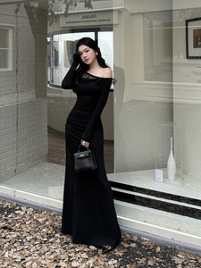 伊莉雅蕾丝荡领一字肩长袖连衣裙女 秋季高级感修身连衣裙XY25347