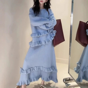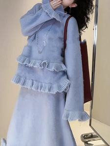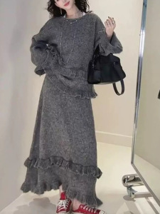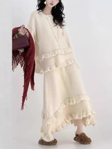 韩系针织套装女秋冬新款跨境花边软糯套头毛衣松紧腰半身裙两套装