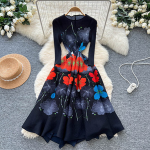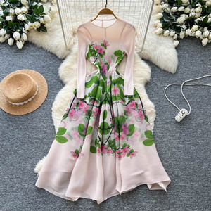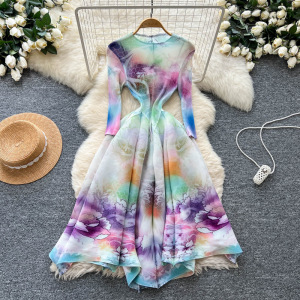 欧美时尚洋气彩色印花压褶连衣裙女秋季高级感收腰垂感大摆长裙子