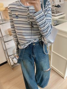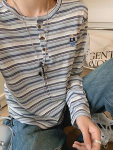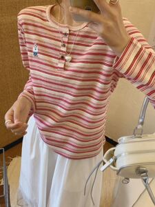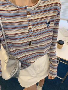 韩系Erume卡通维尼熊彩色条纹半开扣打底衫 早秋上新韩版休闲女装