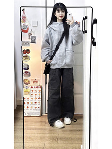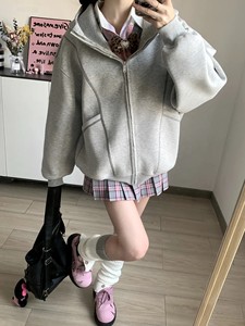 美式复古分割线条连帽卫衣女2025新秋季高级感宽松休闲灰色外套