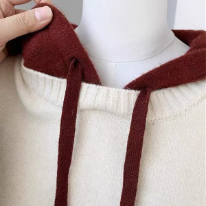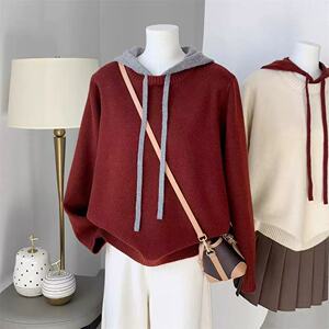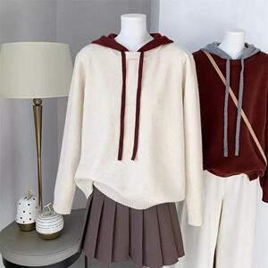 质感韩系撞色连帽抽绳套头毛衣女装秋冬新款简约慵懒风软糯针织衫