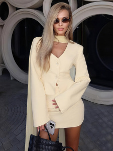 欧美2025秋冬新款女装气质修身纯色外套网纱围巾领包臀短裙三件套