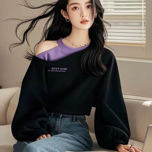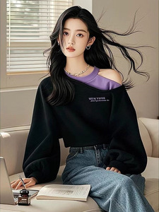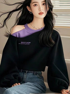 2025新款爆款韩系慵懒风设计感美式宽松黑色印花假两件斜肩卫衣秋