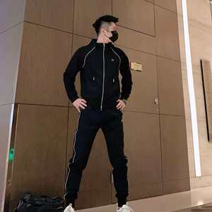欧货2025时尚春秋新款套装男士休闲连帽两件套黑色洋气百搭套装