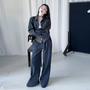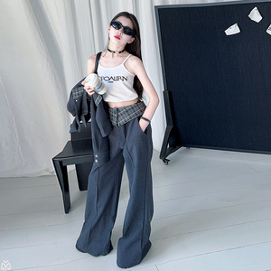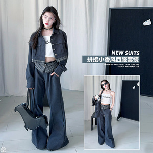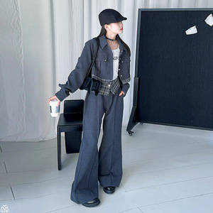 女中童2025秋季新款韩版时尚格子拼接短款外套高腰休闲阔腿裤套装
