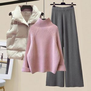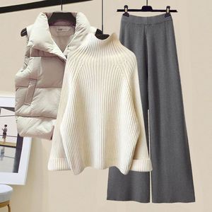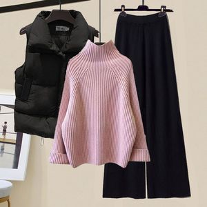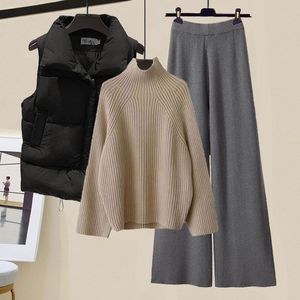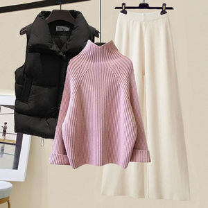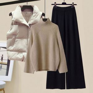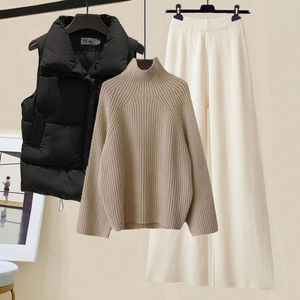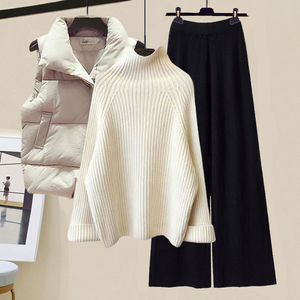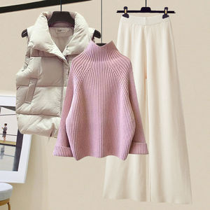 冬季穿搭一整套2025新款洋气棉服马甲高领毛衣女显瘦阔腿裤三件套