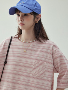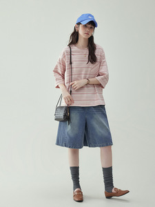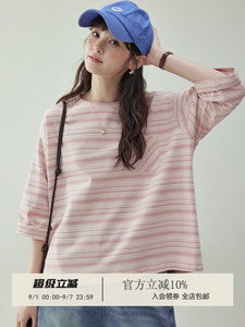 「北岛AMUU原创」减龄粉色条纹七分袖t恤女夏季新款宽松口袋上衣