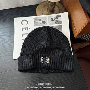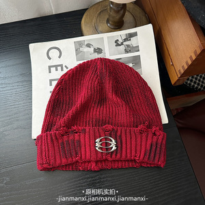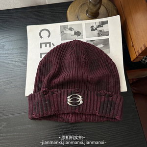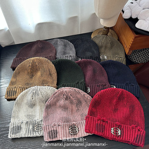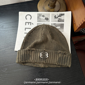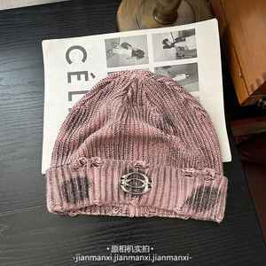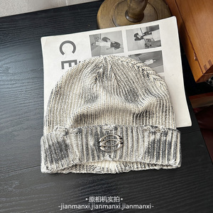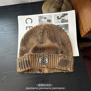 个性做旧脏脏破洞针织帽秋冬翻边套头帽保暖洋气字母标百搭毛线帽
