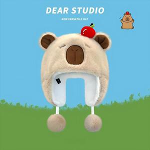卡皮巴拉帽子围巾一体儿童保暖加厚毛绒帽男女宝宝防寒冬款护耳帽