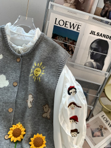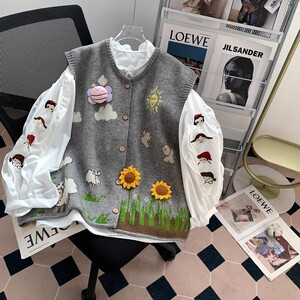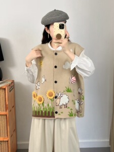 可爱减龄卡通提花向日葵针织马甲女2025秋冬新款森系宽松毛衣背心