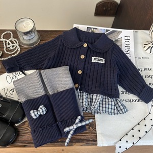 韩版童装2025新款秋季女童拼接格子贴标毛衣开衫儿童堆堆袜打底裤