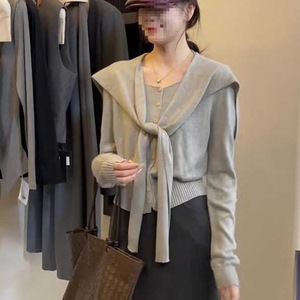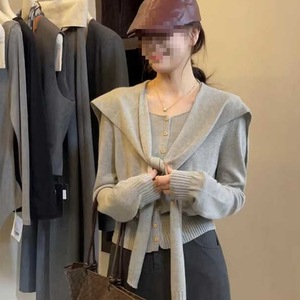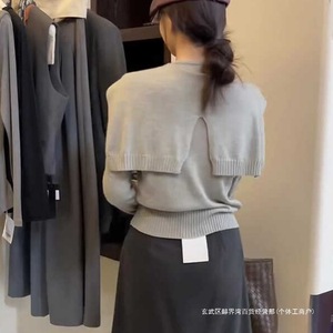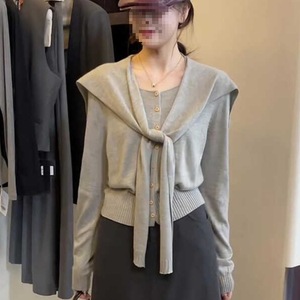 跨境5秋季新韩系松弛感灰色针织开衫女薄外套搭配披肩两件套燕麦
