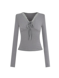 美拉德蕾丝边V领打底T恤女春秋新款独特收腰修身显瘦内搭长袖上衣