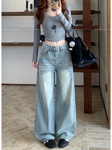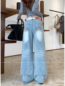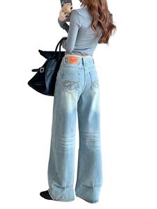 小个子美式复古口袋刺绣牛仔裤女秋季2025新款拖地高腰宽松阔腿裤
