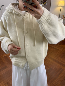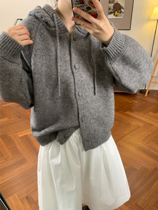 韩系复古南瓜橘连帽毛衣外套女秋冬新款宽松显瘦百搭针织开衫上衣