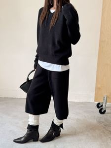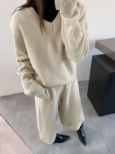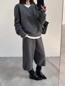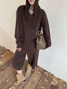 简约针织套装女装秋冬新款跨境时尚休闲V领套头毛衣七分裤两件套