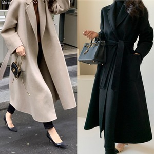 韩国ins法式气质双口袋系带收腰长款毛呢大衣宽松浴袍款呢子外套